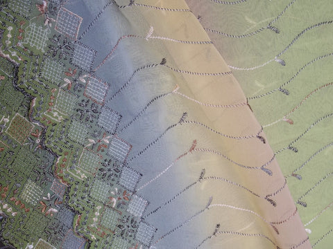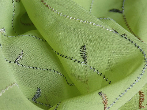 Long georgette shaded scarf with delicate embroidered borders. Primary color: soft willow green. Secondary colors: sand and slate blue. This would make an excellent semi-sheer overlay fabric or window panel. Fiber: synthetic. This vintage scarf is in good condition with a few minor pulls. From a smoke-free home.
